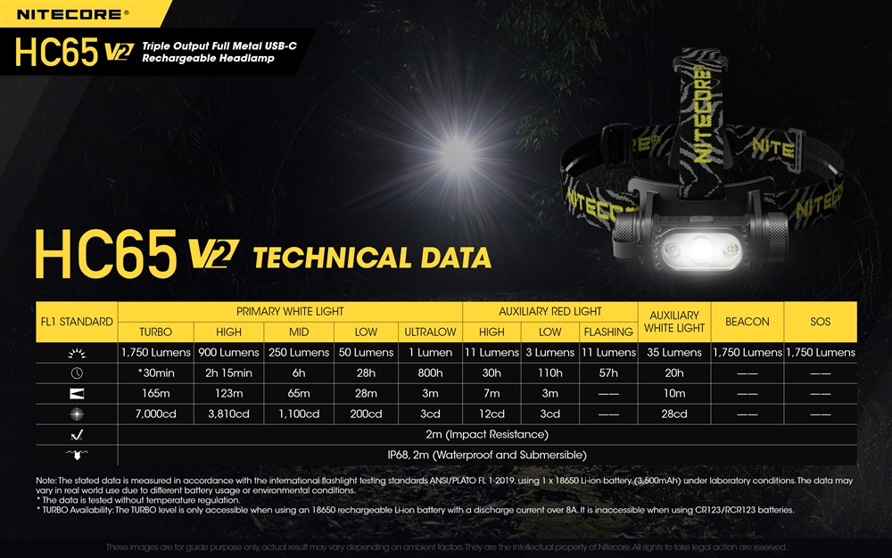 HC65 v2 je opremljena s 3500 mAh visoko zmogljivo baterijo 18650, ki se ponaša z izjemnimi 680 urami delovanja pri zelo nizki temperaturi. Ta svetilka je bila nadgrajena tudi s polnilnim priključkom USB-C za izboljšan čas polnjenja! LED lučka pod stikalom za vklop deluje tudi kot indikator stanja polnjenja in indikator napolnjenosti baterije.