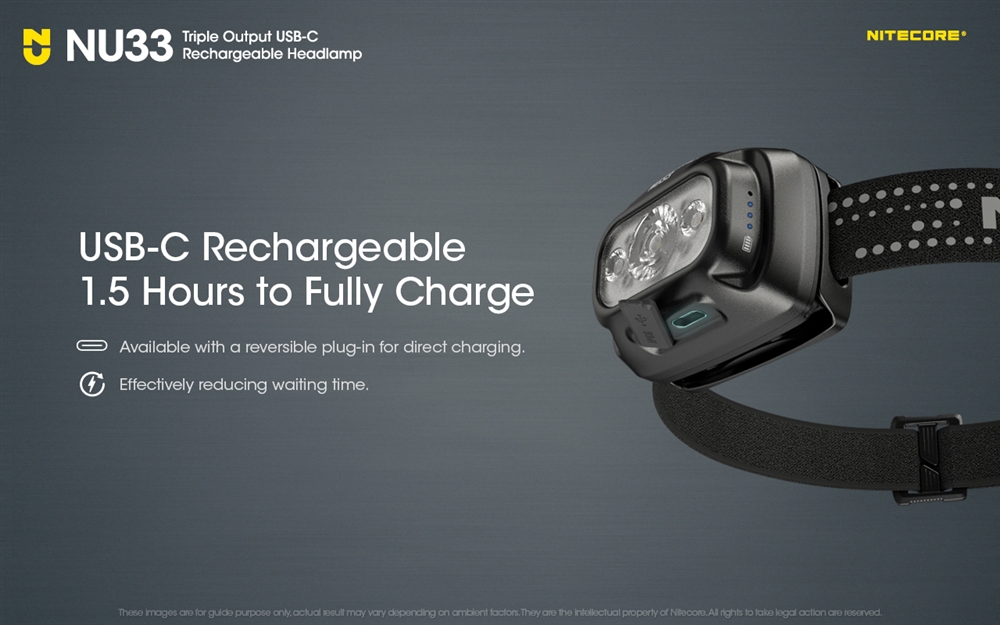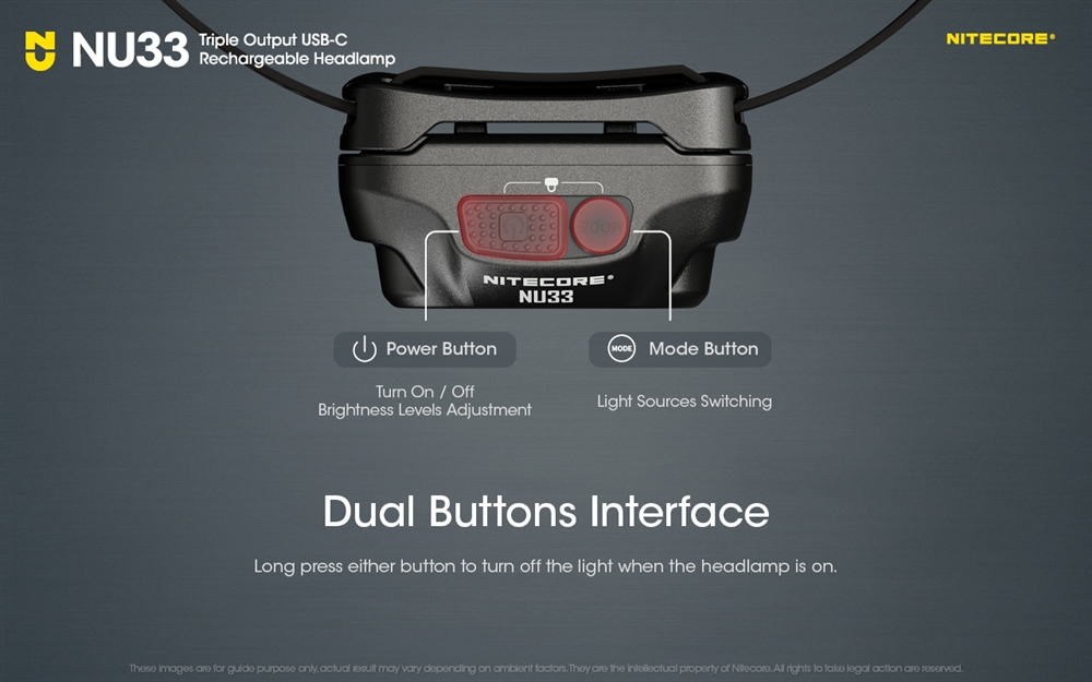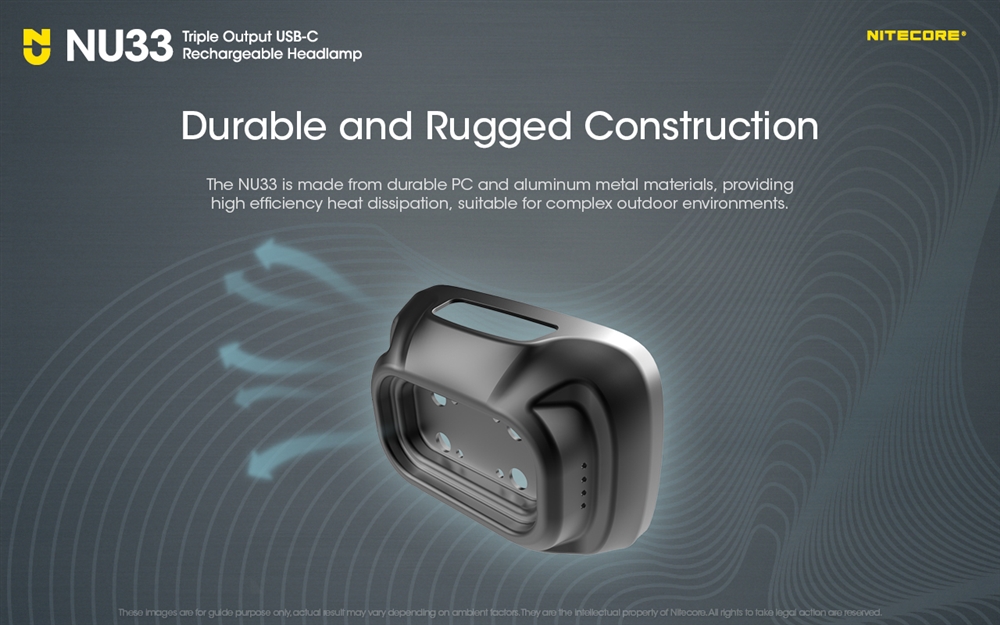 Športna svetilka NU33 ima oceno vodoodpornosti IP66, ima drzno novo aerodinamično zasnovo enodelnega ohišja, ki učinkovito odvaja toploto in je poleg tega videti elegantno. Na novo zasnovan naglavni trak je koži prijazen in ima velike svetle odsevne trakove, ki zagotavljajo vidnost in zaščito. Lahka NU33 je 15 % manjša od NU32 in je v središču pozornosti kot nova vsestranska čelna svetilka Nitecore za nočni tek, pustolovščine na prostem ali kampiranje.