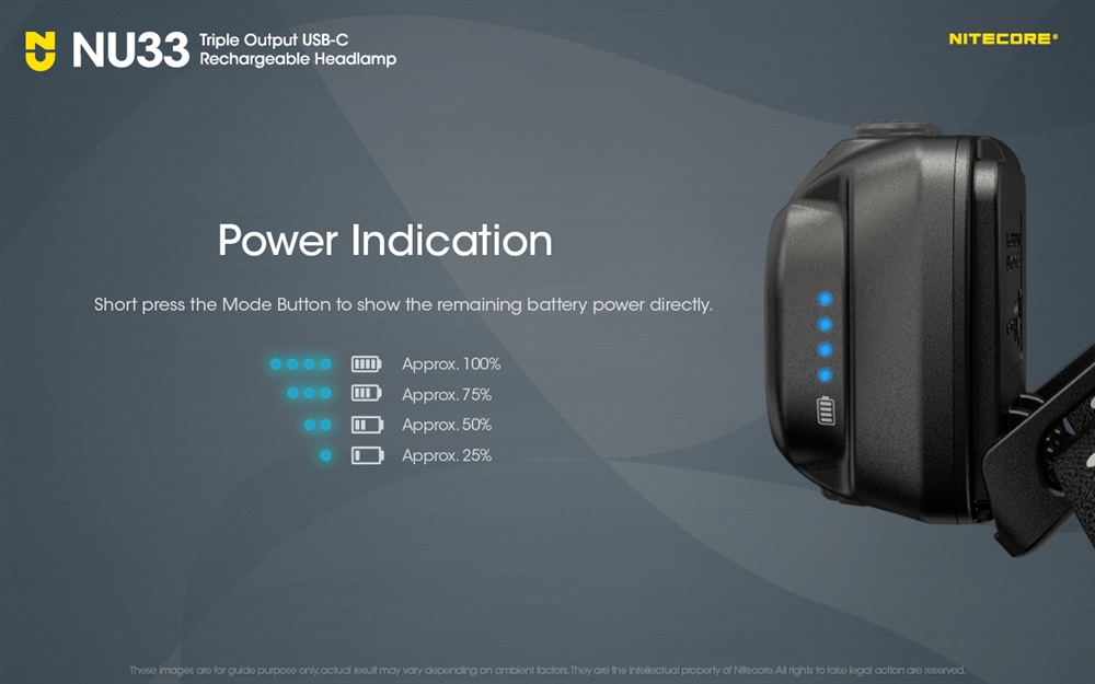 Športna svetilka NU33 ima vgrajeno polnilno baterijo visoke zmogljivosti, ki lahko pri najnižji nastavitvi doseže do 147 ur delovanja. Zdaj z vgrajenim vhodom USB-C se NU33 hitro napolni v samo eni uri in pol. Indikator napajanja vam pove, kdaj je čas za polnjenje, medtem ko način zaklepanja preprečuje nenamerno aktiviranje.