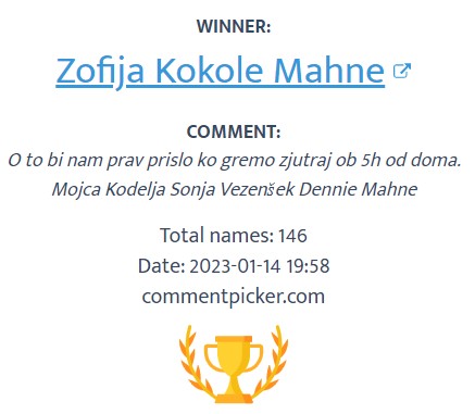 Srečni nagrajenec je uporabnik #Zofija Kokole Mahne, kateri za osvojeno nagrado iskreno čestitamo in hkrati želimo čimveč lepih trenutkov preživetih z novo svetilko!